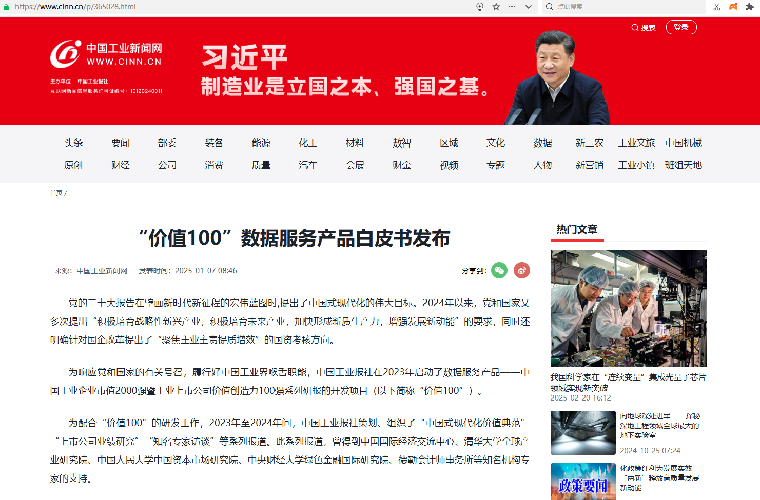 为配合“价值100”的研发工作,2023年至2024年间,中国工业报社策划、组织了“中国式现代化价值典范”“上市公司业绩研究”“知名专家访谈”等系列报道。此系列报道,曾得到中国国际经济交流中心、清华大学全球产业研究院、中国人民大学中国资本市场研究院、中央财经大学绿色金融国际研究院、德勤会计师事务所等知名机构专家的指点。